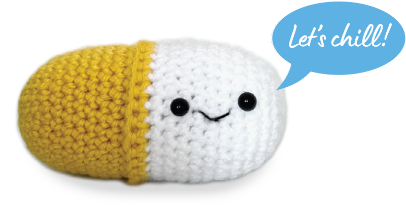 Check out our shop to see a selection of crocheted stress-relieving characters, like Chill Pill!